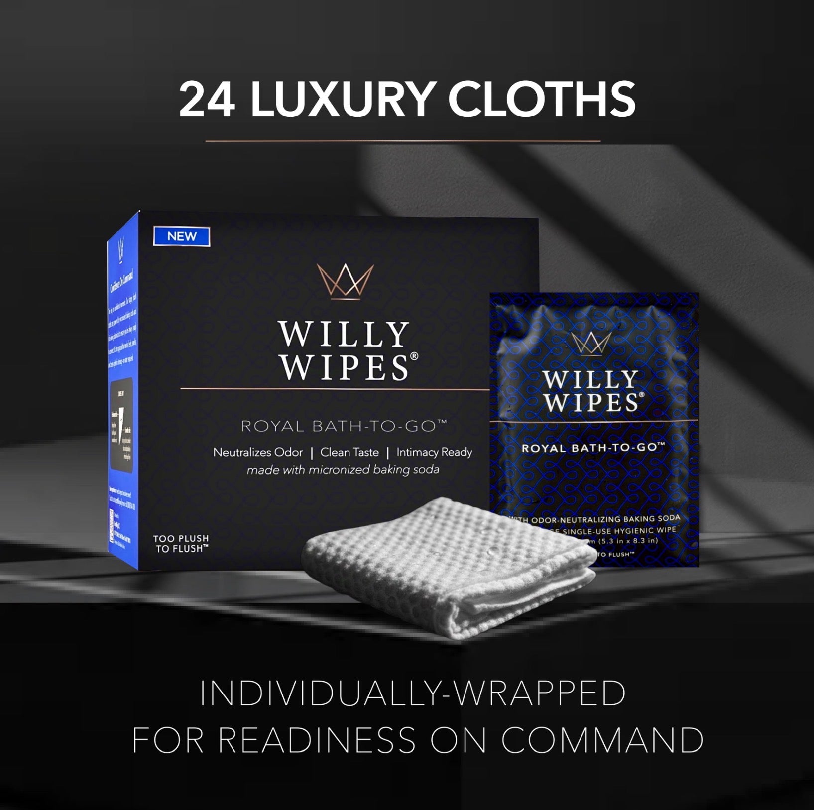 Willy Wipes® Royal Bath-to-Go | The Entry Ritual. Your baseline for daily excellence. One 24-count box of 100% plant-based viscose wipes. Perfect for your home station.